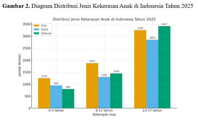 Diagram kedua memperlihatkan distribusi jenis kekerasan. Pada kelompok usia 0–5 tahun, kekerasan fisik menempati porsi terbesar. Namun, pada usia 6–12 tahun, kekerasan psikis mulai meningkat, terutama dalam bentuk perundungan (bullying) dan tekanan emosional dari orang tua maupun guru. Sementara itu, pada kelompok usia 13–17 tahun, kekerasan seksual mengalami lonjakan signifikan, menunjukkan betapa rentannya remaja terhadap eksploitasi maupun pelecehan seksual. Temuan ini memberikan alarm keras bagi pemerintah dan masyarakat untuk memperketat perlindungan, bukan hanya dalam bentuk hukum, tetapi juga pengawasan sosial dan pendidikan seksualitas yang komprehensif[6].