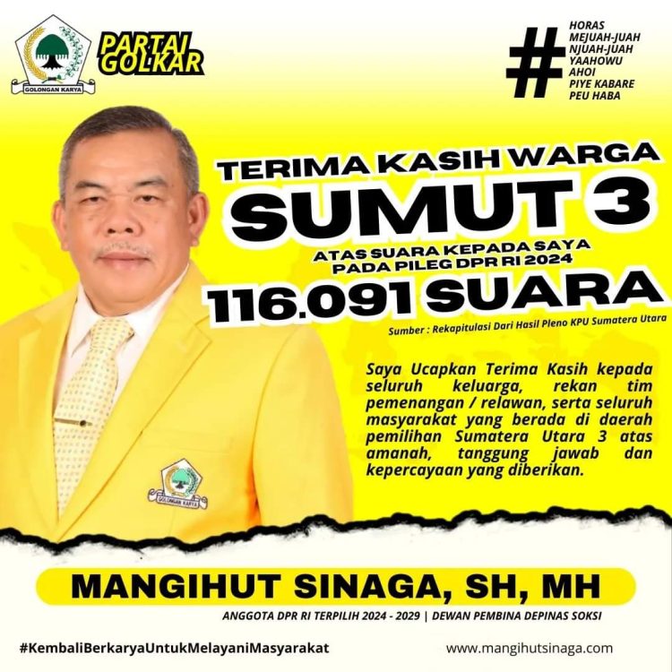 “Pada Rabu (20/3-2024) malam, KPU RI telah membacakan dan menetapkan hasil perolehan suara tingkat Daerah pemilihan Sumatera Utara (Dapil Sumut) 3, dan saya Mangihut Sinaga telah menjadi anggota DPR RI Partai Golkar dari Dapil Sumut III.